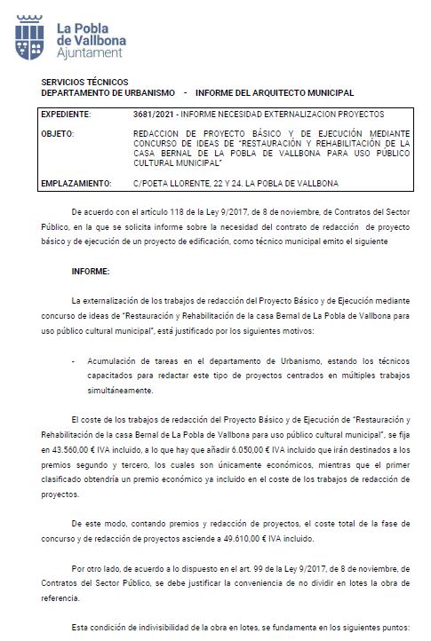 Vallbona ha externalizado la redacción del proyecto básico y de ejecución, a